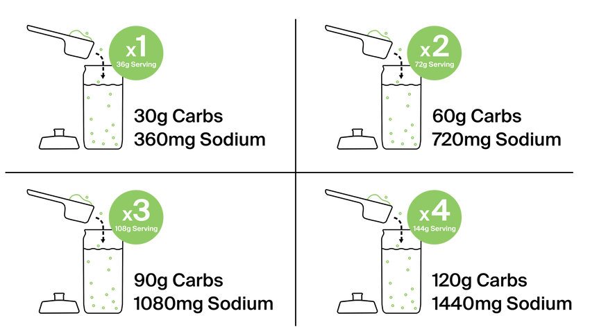During intense activity, your body relies on carbohydrates for energy and electrolytes—particularly sodium—for hydration and sustained performance. Each serving provides 30g of carbohydrates and 360mg of sodium, with intake increasing based on duration and intensity.